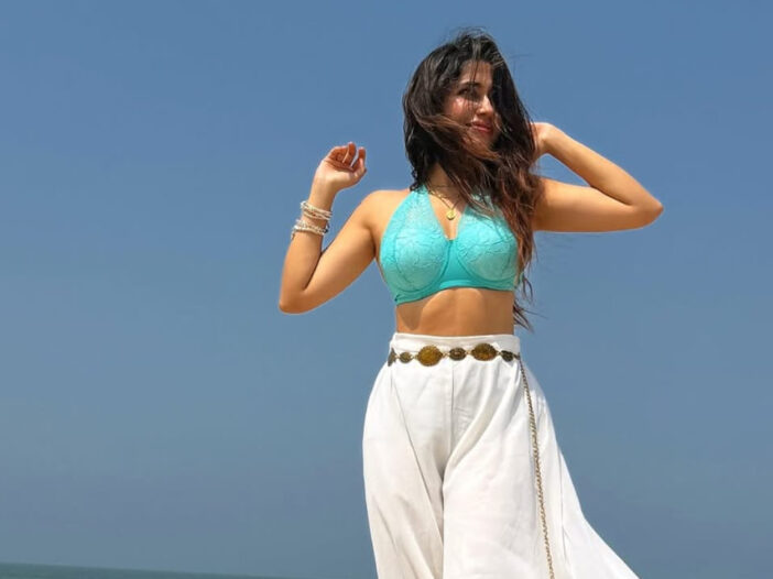 आकाशी रंगाचा डीप नेक ब्रालेट टॉप आणि पांढऱ्या रंगाची सैल पलाझो पँट असा तिचा ग्लॅमरस आणि स्टायलिश लूक चाहत्यांचे लक्ष वेधून घेत आहे.