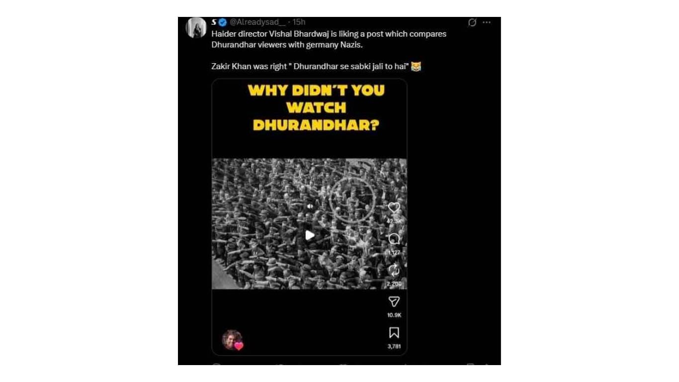प्रसिद्ध चित्रपट दिग्दर्शक विशाल भारद्वाज हे सोशल मीडियावरील एका ‘लाईक’मुळे वादाच्या भोवऱ्यात सापडले आहेत. ‘धुरंधर 2’ या ब्लॉकबस्टर चित्रपटाच्या प्रेक्षकांची तुलना नाझींशी करणाऱ्या एका रीलला त्यांनी ‘लाईक’ केलं. त्यांच्या या एका लाईकवरून हा वाद निर्माण झाला आहे. सध्याच्या सोशल मीडियाच्या काळात लहानातली लहान गोष्टसुद्धा लोकांच्या नजरेतून सुटत नाही. विशाल भारद्वाज यांच्या बाबतीत नेमकं हेच घडलंय. एक्स (ट्विटर) या सोशल मीडिया प्लॅटफॉर्मवर एका युजरने स्क्रीनशॉट शेअर केल्यानंतर हे संपूर्ण प्रकरण चांगलंच तापलं.