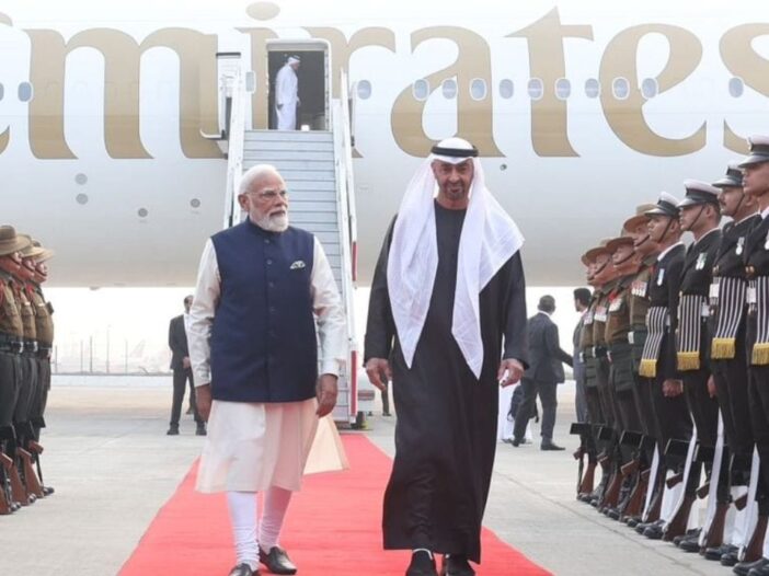 संयुक्त अरब अमिराती राष्ट्राध्यक्ष शेख मोहम्मद बिन झायेद अल नाहयान हे भारताच्या दोऱ्यावर आले आहेत. त्यांनी केवळ दोन तास भारतात येऊन पंतप्रधान नरेंद्र मोदी यांची धावती भेट घेतल्याने जागतिक राजकारणात चर्चा सुरु आहे. मैत्रीचे नाते वृंद्धीगत करण्यासाठी सर्व प्रोटोकॉल बाजूला ठेवत पंतप्रधान नरेंद्र मोदी यांनी स्वत: जातीने विमानतळावर जाऊन शेख मोहम्मद बिन झायेद अल नाहयान यांचे जोशात स्वागत केले आहे.