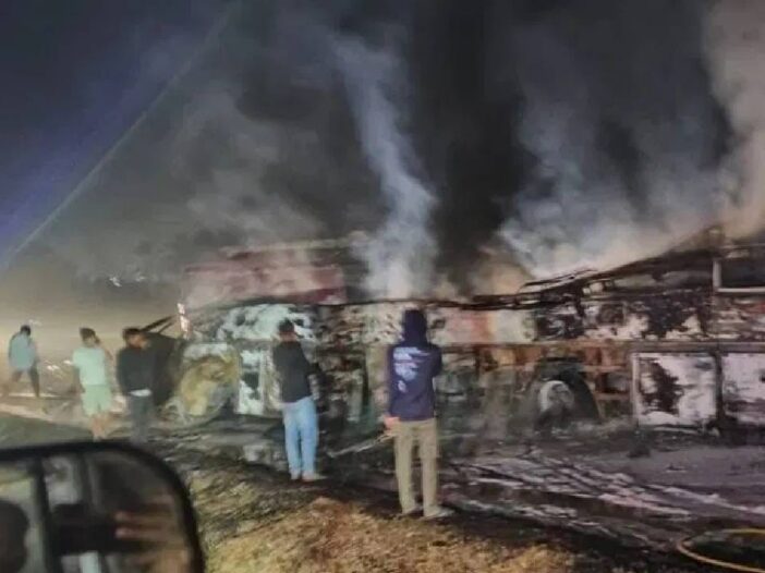 ही घटना राष्ट्रीय महामार्गावर घडली. धडकेनंतर काही कळताच बसला मोठी आग लागली. ज्यावेळी ही घटना घडली, त्यावेळी बसमधील प्रवासी झोपले होते. कोणाला काही कळण्यापूर्वीच आगीचा भडका उडाला. आगीच्या घटनेबद्दल कळाताच बचावकार्य सुरू करण्यात आले. जखमी प्रवाशांना जवळच्या रुग्णालयात दाखल करण्यात आले असून त्यांच्यावर उपचार सुरू आहेत.