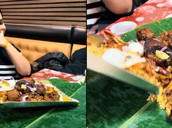 या फावड्यात बिर्याणी आणि इतर नॉनव्हेज पदार्थ भरलेले दिसतात. टेबलवर आधीच ठेवलेल्या केळीच्या पानावर तो वेटर फावड्याने जेवण ओततो. त्या पदार्थांमध्ये मासे, अंडी आणि चिकनचे तुकडे स्पष्टपणे दिसत असून संपूर्ण प्रकार बिर्याणी सर्व्ह करण्याचा असल्याचं लक्षात येतं.
