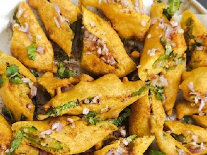 यानंतर दुसऱ्या भांड्यात बेसन, हळद, थोडा ओवा आणि आवश्यकतेनुसार पाणी घालून मध्यम घट्टसर पीठ तयार करावे. कढईत तेल गरम करून भरलेली मिरची बेसनाच्या पीठात बुडवून गरम तेलात सोडावी.