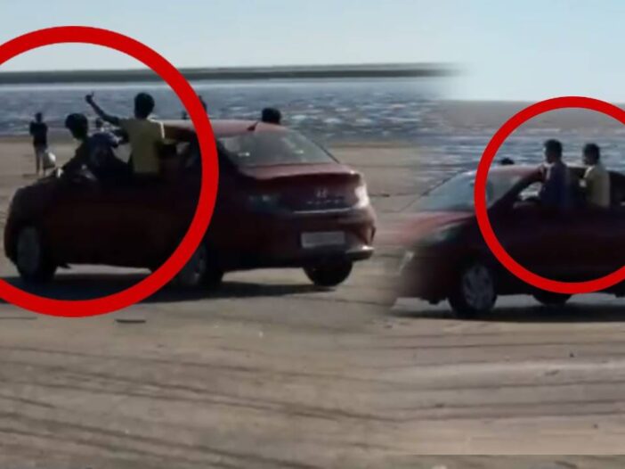 विशेष म्हणजे बिचवर इतरही काही लोक आहेत. लोक आनंदात बिचवर फिरत असताना दुसरीकडे ही महिला मात्र आपल्या मुलांना खिडकीमध्ये उभे करून स्टंट करत आहे. भरधाव वेगात ती कार चालवत आहे.