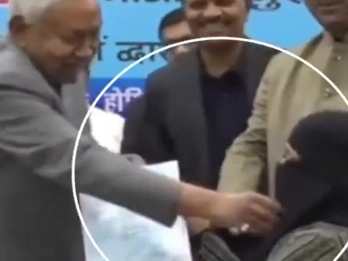 Video Viral : सोशल मीडियावर सध्या बिहारचे मुख्यमंत्री नितीश कुमार यांचा एक व्हिडीओ व्हायरल होत आहे. ज्यामध्ये त्यांनी सर्वांसमोर एका डॉक्टर मुस्लीम महिलेचा बुरखा ओढला आहे. ज्यामुळे सर्वत्र संतापाची लाट उसळली आहे. 15 डिसेंबर रोजी, जेव्हा मुख्यमंत्री नितीश कुमार आयुष डॉक्टरांना नियुक्ती पत्रे देत होते, तेव्हा त्यांनी त्यापैकी एका नुसरत नावाच्या महिला डॉक्टरचा बुरखा ओढला. मुख्यमंत्री नितीश कुमार यांच्या लाजिरवाण्या वागणुकीवर विरोधकांनी संताप व्यक्त केला आहे. काँग्रेसपासून शिवसेना (UBT) नेत्यांनी नितीश कुमार यांच्यावर निशाणा साधला आहे.