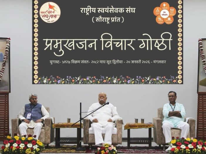 राजकोट, 20 जानेवारी : राष्ट्रीय स्वयंसेवक संघाचे (आरएसएस) सरसंघचालक डॉ. मोहन भागवत यांनी आज संघाच्या शताब्दी वर्षानिमित्त राजकोट येथील एका जाहीर सभेत सौराष्ट्र आणि कच्छमधील नागरिकांशी संवाद साधला. सेवा भारती भवन येथील आयोजित कार्यक्रमात सरसंघचालकांनी सांगितले की, ‘राष्ट्रीय हितावर कोणाचीही मक्तेदारी असू शकत नाही. ही आपली सामूहिक जबाबदारी आहे आणि संघ अशा कामात गुंतलेल्या सर्वांच्या पाठीशी उभा आहे.’
