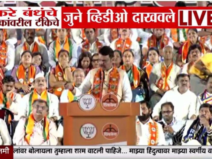 शिवतीर्थावरील सभेत मुख्यमंत्री देवेंद्र फडणवीस यांनी ‘लाव रे ते व्हिडोओ’ म्हणत राज आणि उद्धव ठाकरेंचे एकमेकांवरील टीकेचे जुने व्हिडीओ भर सभेत दाखवले. उत्तर हे ठाकरे बंधूंनीच दिलंय असं म्हणत देवेंद्र फडणवीसांनी ठाकरे बंधूंना चांगलचं डिवचलं आहे. मी कोणाकडून तरी शब्द उधार घेतो आणि म्हणतो जरा ‘लाव रे तो व्हिडोओ’ असं म्हणत फडणवीस यांनी ठाकरे बंधूंचे व्हिडीओ लावून एकच खळबळ उडवून दिली. या दोघांनी एकमेकांची पोलखोल केली आहे. आता तुमचं तुम्हीच ठरवा, असं आवाहनही त्यांनी मतदारांना केलंय.