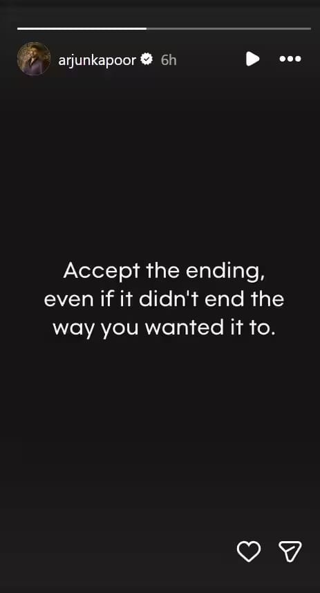 सांगायचं झालं तर, खरं तर, 9 एप्रिल 2026 रोजी, अर्जुन कपूरने त्याच्या इंस्टाग्राम स्टोरीवर एक गूढ आणि रहस्यमय पोस्ट शेअर केली, ज्यामुळे त्याच्या चाहत्यांमध्ये चिंतेचे वातावरण निर्माण झालं आहे. आपल्या पोस्टमध्ये अर्जुनने लिहिले, “गोष्टी तुमच्या मनासारख्या संपल्या नाहीत तरीही, तुम्ही शेवट स्वीकारला पाहिजे.” त्याने ही पोस्ट का केली आहे की नाही हे उघड केले नाही, परंतु सोशल मीडियावर लोकांनी अभिनेत्यासोबत सर्व काही ठीक आहे की नाही याबद्दल तर्कवितर्क सुरू केले आहेत.