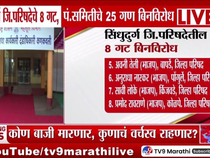सिंधुदुर्ग जिल्ह्यात स्थानिक स्वराज्य संस्थांच्या निवडणुकांमध्ये एक महत्त्वपूर्ण चित्र समोर आले आहे. जिल्हा परिषदेचे आठ गट आणि पंचायत समितीचे सतरा गण पूर्णपणे बिनविरोध निवडून आले आहेत. यामुळे निवडणूक प्रक्रियेतील काही जागांवर उमेदवारांना कोणतीही स्पर्धा करावी लागली नाही.
