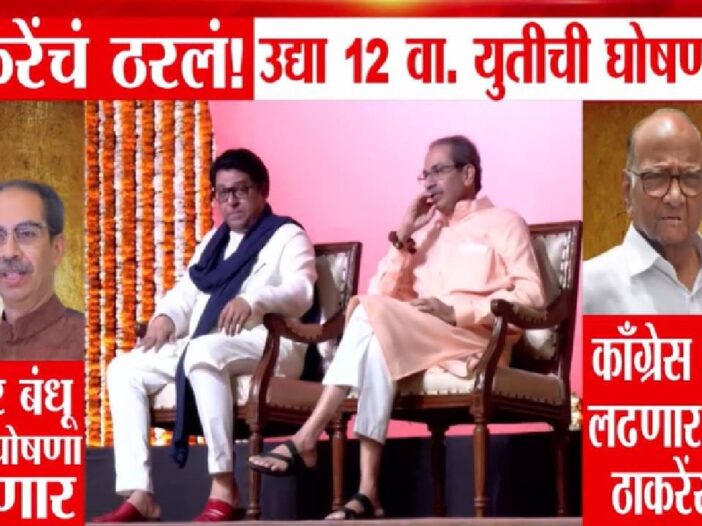 ठाकरे बंधूंच्या युतीचा मुहूर्त अखेर निश्चित झाला असून, उद्या दुपारी १२ वाजता पत्रकार परिषद घेऊन याची अधिकृत घोषणा केली जाईल. संजय राऊत यांनी ट्वीट करत ही माहिती दिली. शिवसेना (उद्धव बाळासाहेब ठाकरे गट) आणि महाराष्ट्र नवनिर्माण सेना यांच्यातील जागावाटप यशस्वीरित्या पूर्ण झाले असून, यामध्ये कोणतीही रस्सीखेच नसल्याचे राऊत यांनी स्पष्ट केले. या युती अंतर्गत मुंबई, ठाणे, कल्याण-डोंबिवली, पुणे, पिंपरी-चिंचवड, नाशिक आणि छत्रपती संभाजीनगर या सात महानगरपालिकांसाठी दोन्ही पक्ष एकत्र लढणार आहेत. कार्यकर्त्यांनी ही युती स्वीकारली असून, कोणताही विसंवाद नसल्याचे राऊत यांनी नमूद केले. या महत्त्वपूर्ण राजकीय घडामोडीकडे महाराष्ट्राचे लक्ष लागले आहे. राजकारणात कुणीही एकत्र येऊ शकते किंवा वेगळे होऊ शकते, अशी प्रतिक्रिया महायुतीच्या नेत्यांकडून आली.