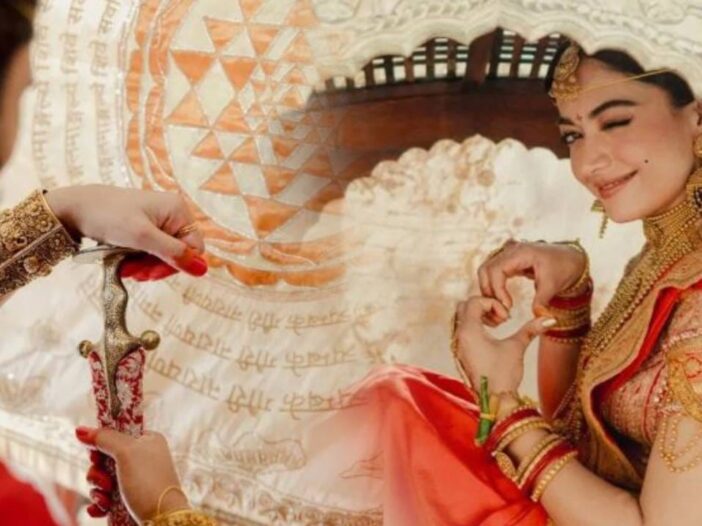 रश्मिका-विजय यांना आपल्या लग्नाच्या माध्यमातून देशाच्या समृद्ध वारशाचे दर्शन घडवून आणायचे होते. त्यांच्या विवाह सोहळ्याची थीम द पिरिऑडिक इरा अशी ठेवण्यात आली होती. या थीमनुसार विजय देवरकोंडा याच्या हातात एक तलवार असल्याचे दिसत आहे. Photo Credit: rvreventzdesign